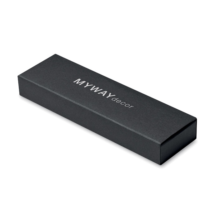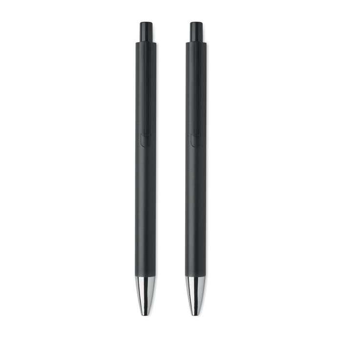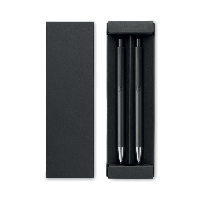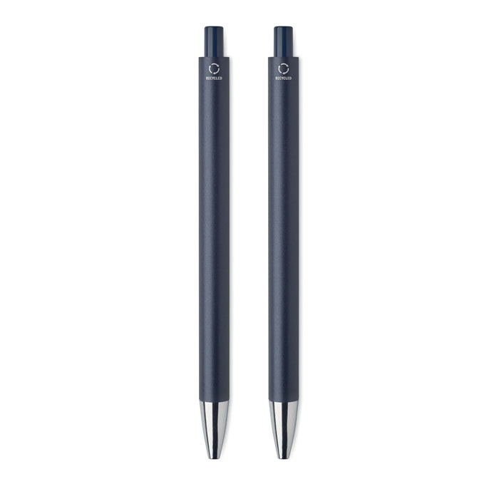 Recycled aluminium pen set with 1 push button ball pen and 1 graphite inkless pen. Blue ink. Presented in recycled paper box.