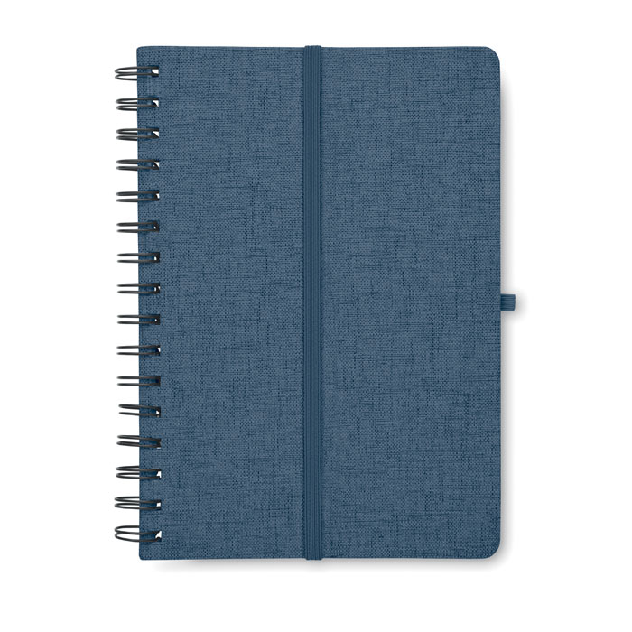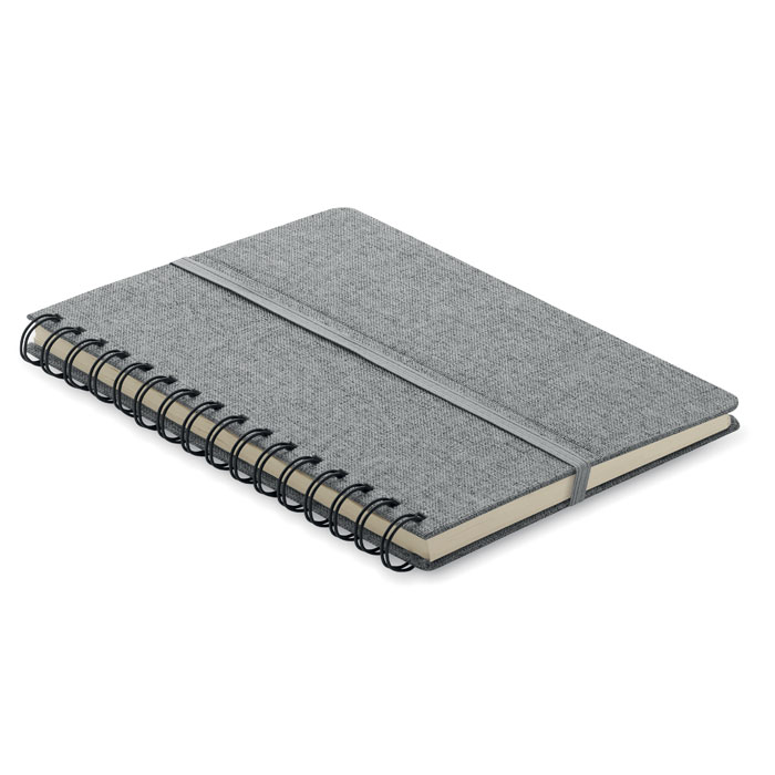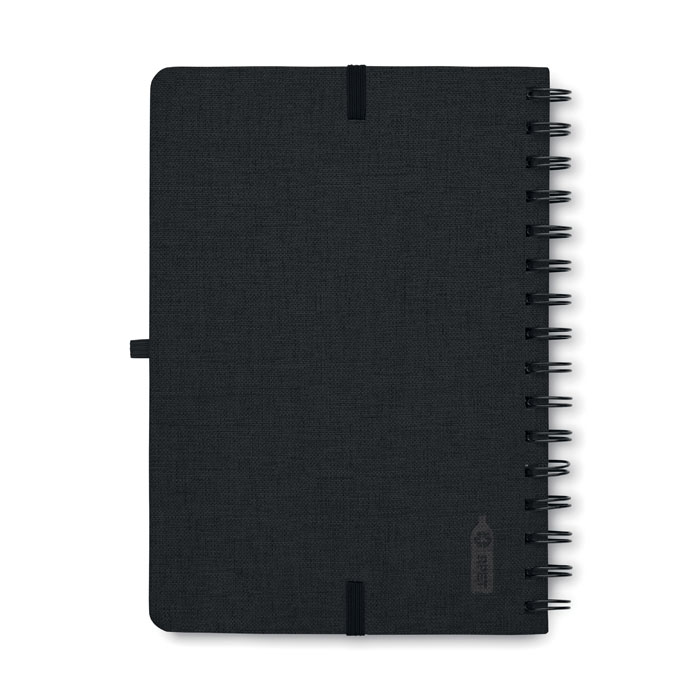 A5 notebook with 600D RPET hard cover with smartphone stand function. Twin-wire. 160 lined pages (80 sheets). 70 gsm recycled paper. Elastic closure strap.