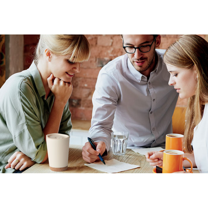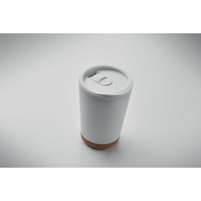 Double wall tumbler in PP with cork base and slide closing drinking mouthpiece lid in PS. Capacity: 300 ml.
