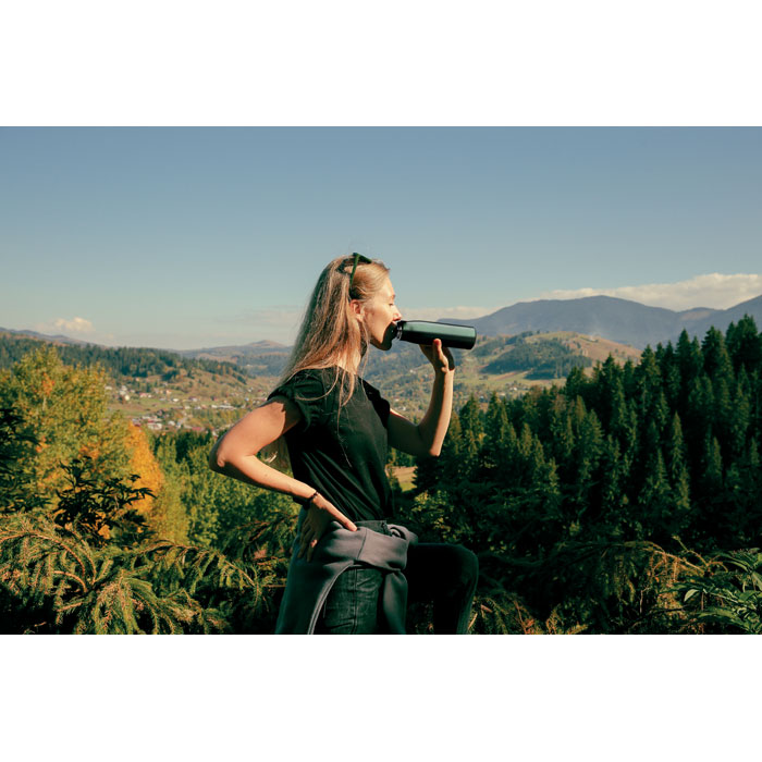 Double wall recycled stainless steel insulated vacuum bottle (90% recycled stainless steel and 10% stainless steel) with integrated cord grip on PP lid. Leak-free. Capacity: 500 ml.