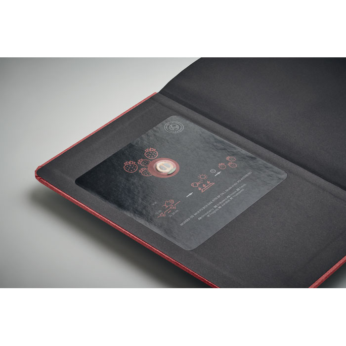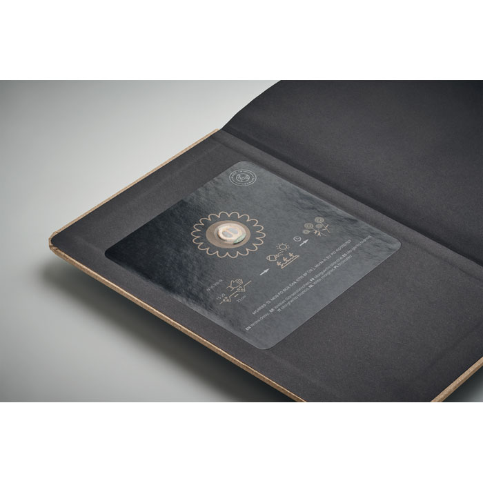 A5 notebook with sustainable hard paper cover. Casebound. 184 lined pages (92 sheets) in recycled paper. Cotton page-marker. Includes sowing seeds. Made in EU. This sustainable notebook has a low environmental impact and makes for a great promotional give-away. Each colour notebook comes with a different type of seed that you can plant in your garden. The colour code indicates the type of seed: Blueberry (04), Strawberry (05), white daisy (13), Apple (48) and Pine tree (60).