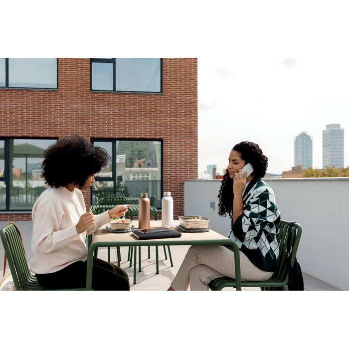 Recycled stainless steel lunch box with PP lid and 4 side clasp closure. Capacity: 850 ml.