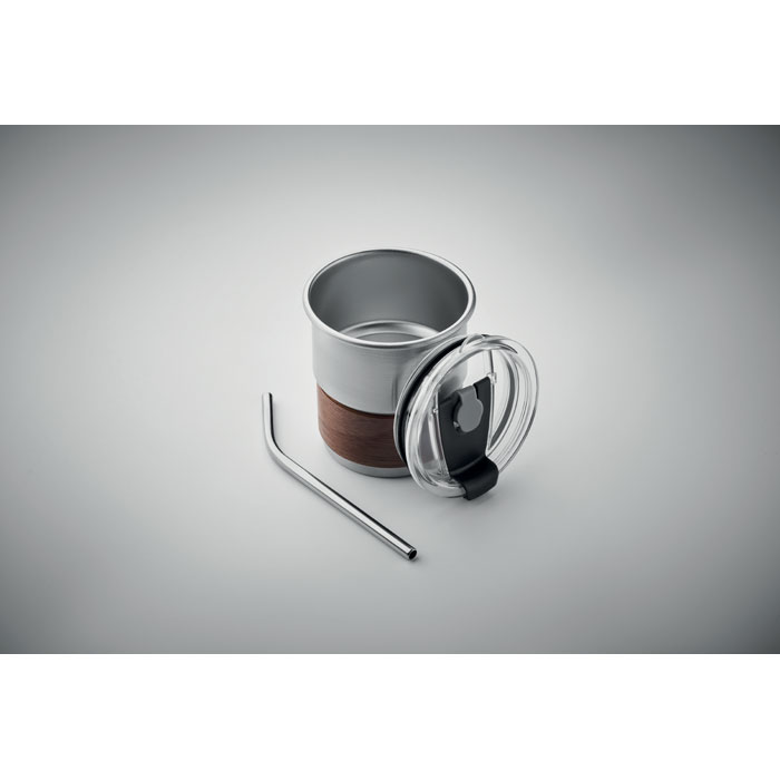 Single wall tumbler in recycled stainless steel (90% recycled stainless steel and 10% stainless steel) with a detachable grip in acacia wood, stainless steel straw. Straw socket and direct drink opening leak-free lid. Capacity: 260 ml. As this is a single walled mug, heat transfer can still occur.