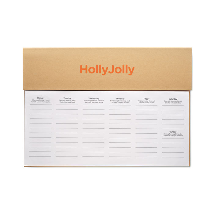 125 page weekly desk planner in 6 languages (EN/DE/FR/ES/IT/NL/PL) with kraft paper cover, carton barrel blue ink push button pen, wooden ruler and sticky note memo pad.