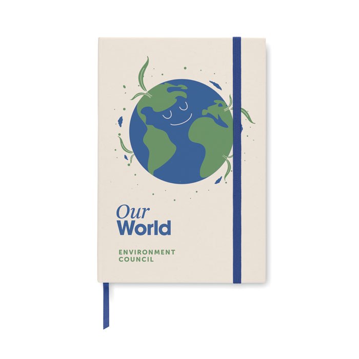 A5 notebook with hard cover made of 70% recycled milk carton pack and 30% recycled paper. Casebound. 160 lined pages (80 sheets 80 gsm) made of recycled paper. Elastic closure strap, ribbon bookmark.