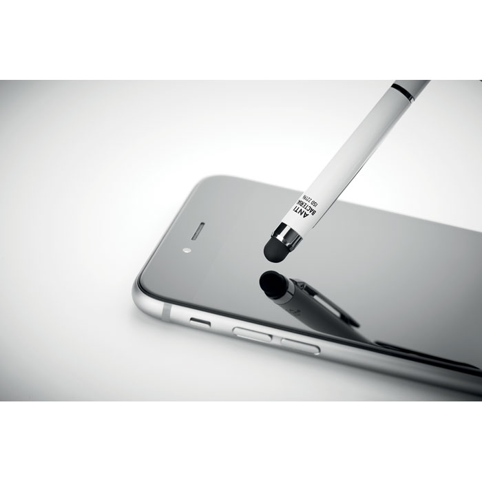 Twist action stylus ball pen in aluminium with antibacterial barrel and shiny chrome clip. ISO 22196. Blue ink.