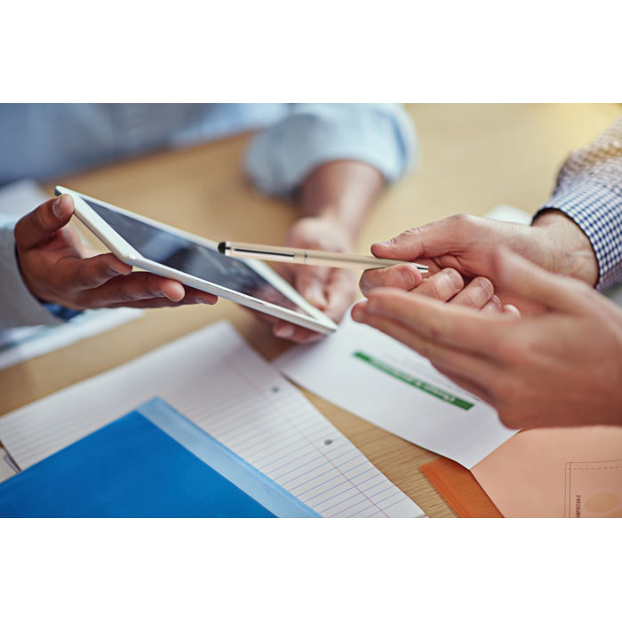 Twist action ball pen in recycled aluminium with stylus and shiny chrome clip. Blue ink.