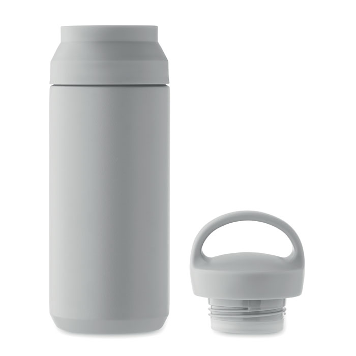 Double wall vacuum insulating bottle in recycled stainless steel (90% recycled stainless steel and 10% stainless steel) with PP double lid opening for easy cleaning. Leak-free. Capacity: 320 ml.