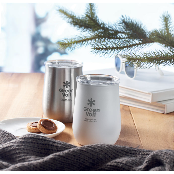 Recycled stainless steel (90% recycled stainless and 10% stainless steel) powder coated mug with lid with sliding sip hole cover. Capacity: 500 ml. As this is a single walled mug heat transfer can still occur.